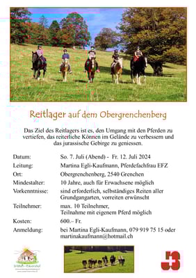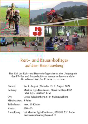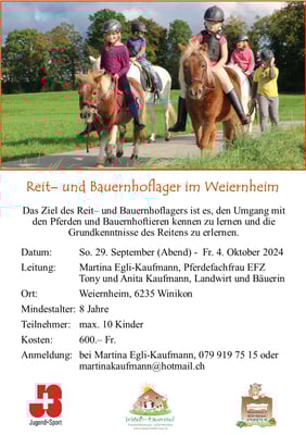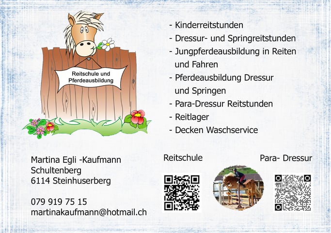 Wöchentlich am Mittwoch Nachmittag, bin ich in Winikon und gebe Reitstunden. Die andern Tage unterrichte ich bei uns im Steinhuserberg. Regelmäßig führen wir auch Reitlager oder Ponythementage durch. Für eine unverbindliche Anfrage, kann man mich sehr gerne per Telefon oder E-Mail kontaktieren.